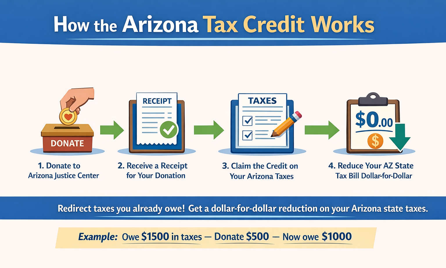 When you make a donation to the Arizona Justice Center through the Arizona Charitable Tax Credit, you’re not giving extra money – you’re redirecting money you already owe in state taxes.